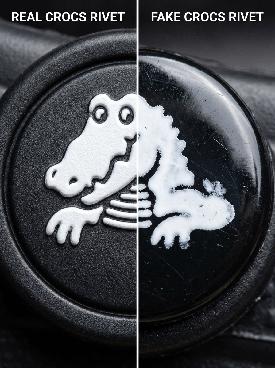 Важный нюанс: расположение и вид логотипов не являются универсальными для всех моделей. В линейках LiteRide, Crocband, Echo или в лимитированных коллаборациях дизайн фурнитуры может сильно отличаться. Где-то логотип будет текстовым, где-то в виде резиновой накладки, а где-то отсутствовать на заклепке вовсе. Поэтому главным критерием остается качество литья: у оригинала надписи всегда читаемые, без размытых краев и лишних кусков пластика, независимо от коллекции.